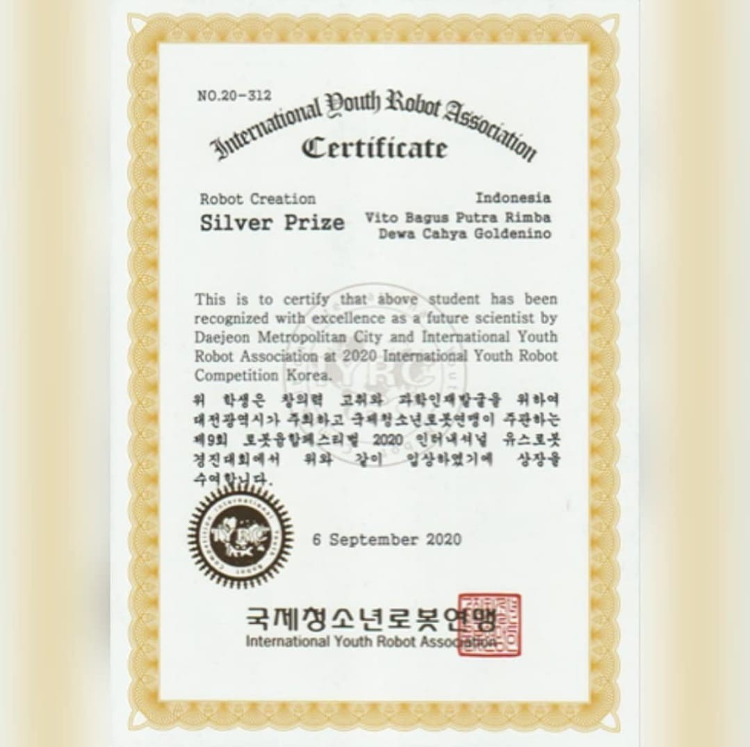 Dewa Cahya Goldenino (Nino) siswa kelas VIII dan Vito Bagus Putra Rimba (Vito) alumni SMP Budi Utama Yogyakarta. Mereka tergabung dalam team Roboschool Indonesia dan menciptakan robot Delivery Gripper Robot, telah memboyong penghargaan Silver Prize untuk kategori Senior Team dalam International Youth Robot Competition 2020 di Daejon Korea Selatan pada 5-6 September 2020.