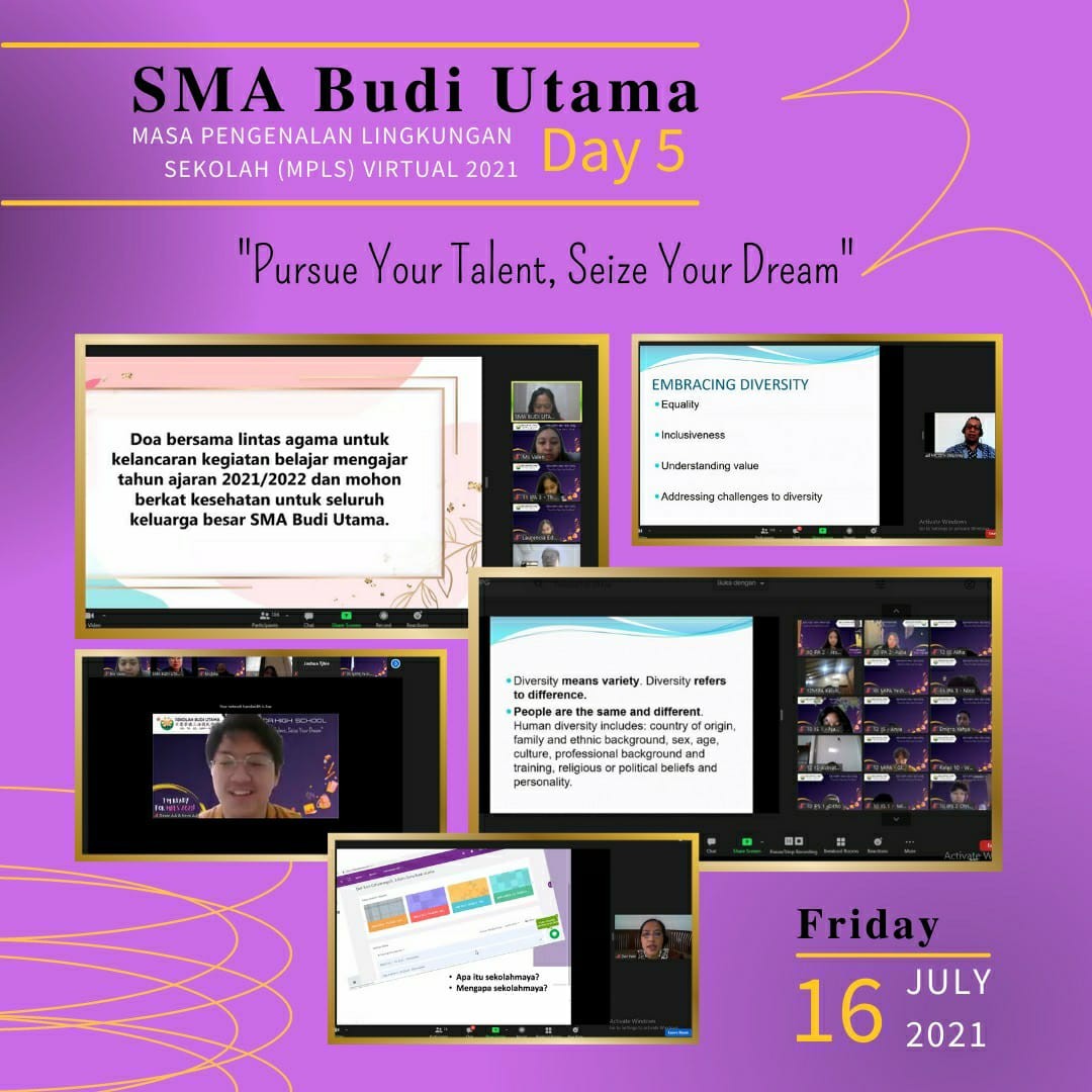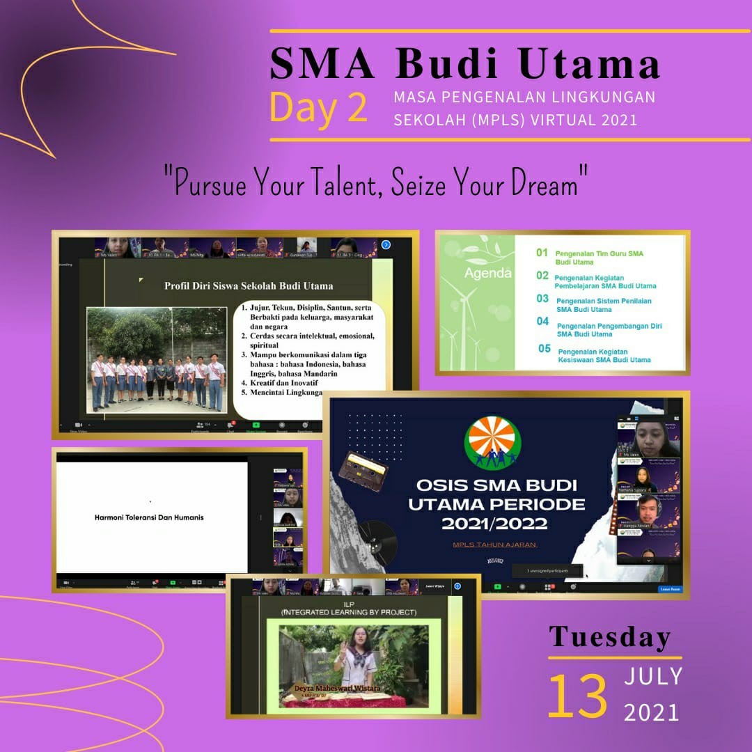 Senin, 12 Juli 2021 merupakan awal tahun ajaran baru 2021/2022 dan hari pertama kegiatan Masa Pengenalan Sekolah (MPLS) untuk siswa siswi baru kelas X SMA Budi Utama dimulai. Tujuan adanya kegiatan MPLS ini adalah untuk mengenalkan lingkungan dan juga kegiatan yang ada di SMA Budi Utama. MPLS tahun ini mengangkat tema Pursue Your Talent, Seize Your Dream, yang berarti SMA Budi Utama akan selalu mendukung para siswa untuk mengejar, meraih mimpi, serta membantu untuk mengenali minat dan bakat yang mereka miliki.