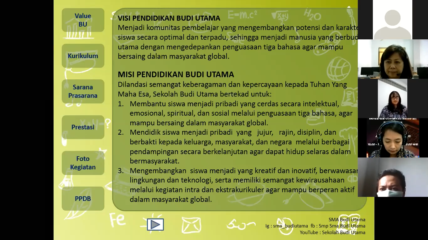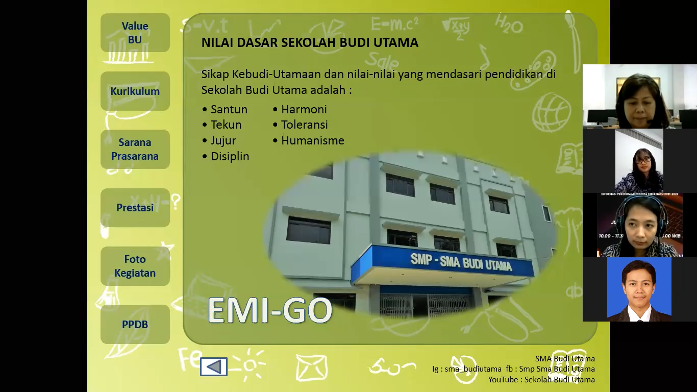 VOH SMA Budi Utama diikuti oleh orang tua murid kelas IX dari berbagai SMP yang berada di Yogyakarta maupun luar Yogyakarta. Acara tersebut dibagi dalam dua sesi. Sesi pertama adalah penyampaian visi, misi, dan nilai dasar Budi Utama, kurikulum, sarana dan prasarana, prestasi sekolah, serta beberapa foto kegiatan SMA Budi Utama. Sesi kedua merupakan penyampaian informasi PPDB 2021/2022 SMA Budi Utama. Penyampaian materi-materi tersebut yang dibawakan oleh Bapak Satrio S. Prihantoro, S.Pd., M.Psi., selaku kepala SMA Budi Utama Yogyakarta.