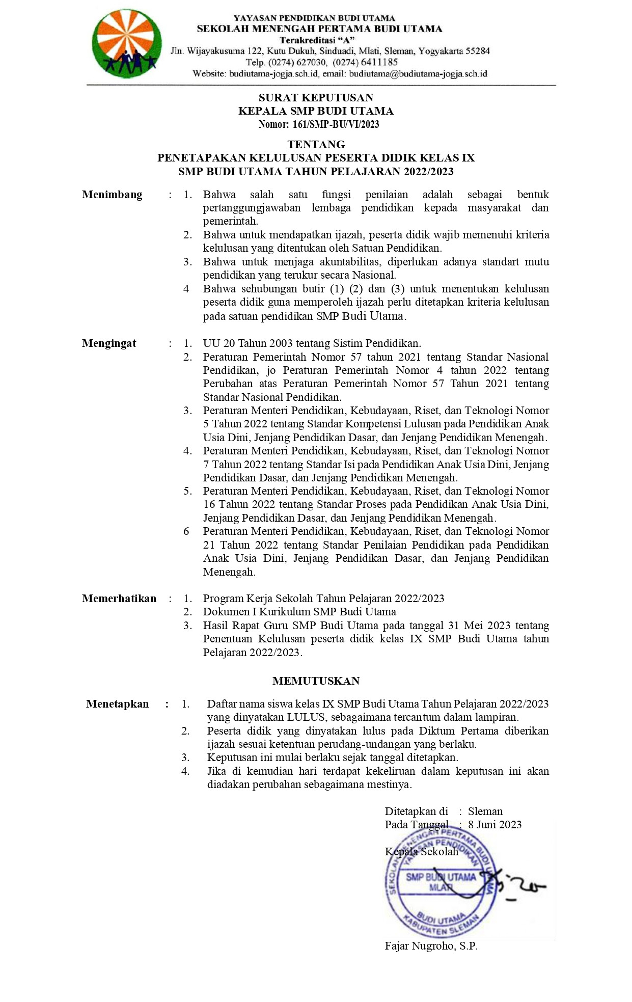 3. PENETAPAN KELULUSAN PESERTA DIDIK SMP BUDI UTAMA TAHUN AJARAN 2022-2023