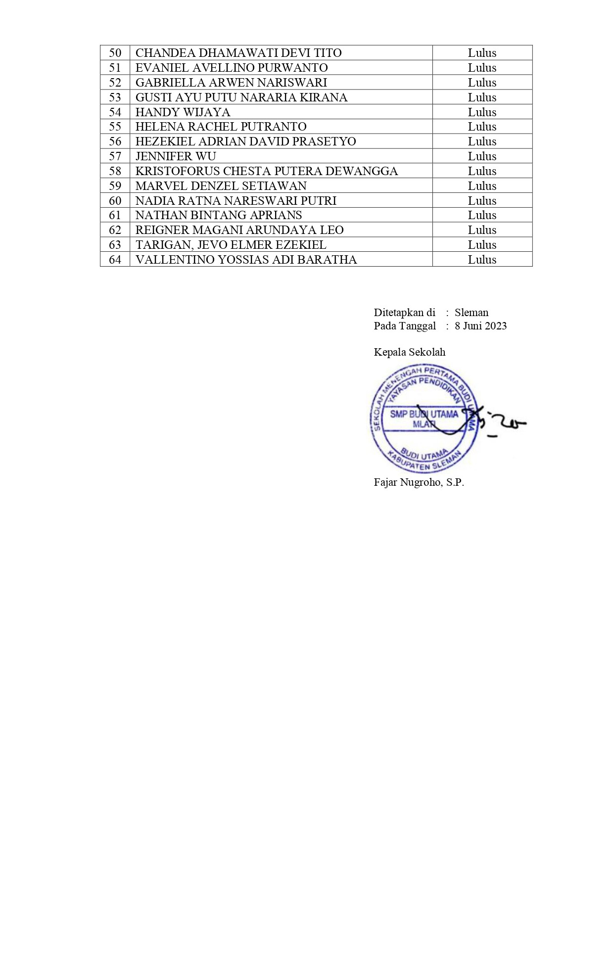 PENETAPAN KELULUSAN PESERTA DIDIK SMP BUDI UTAMA TAHUN AJARAN 2022-2023