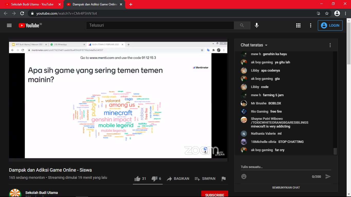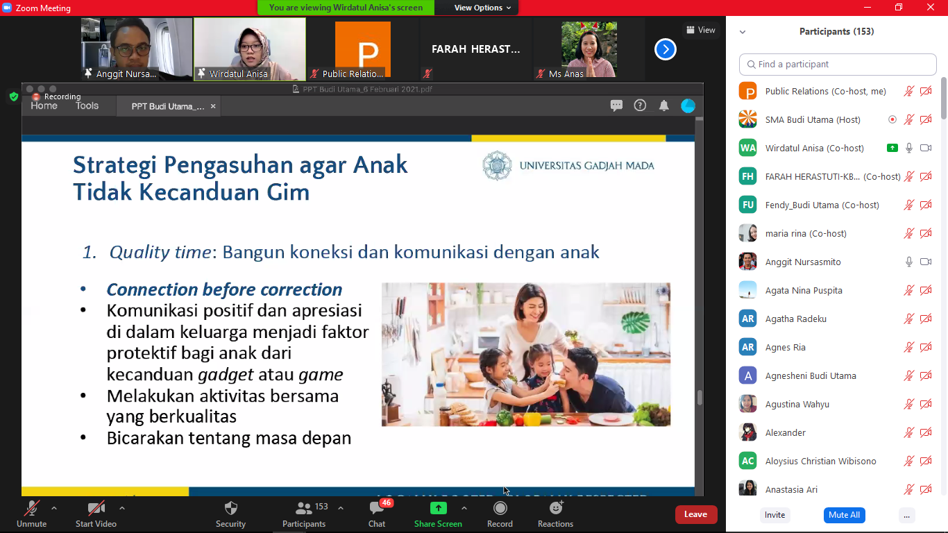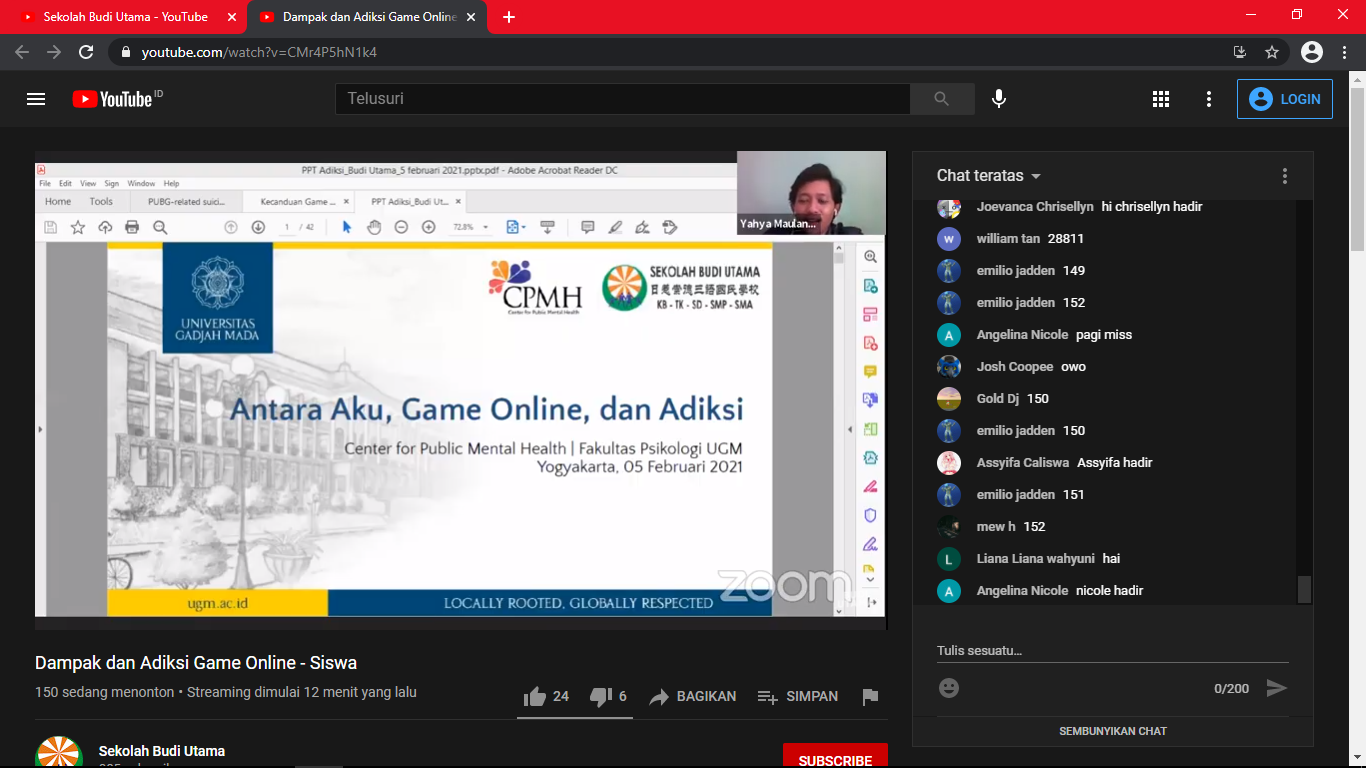 Webinar yang diikuti oleh seluruh warga Sekolah Budi Utama ini diharapkan dapat memberikan pemahaman yang baik mengenai dampak game online sehingga kesadaran untuk bijak bermain game online dan beraktivitas di depan layar dapat terwujud. (rf/vl)