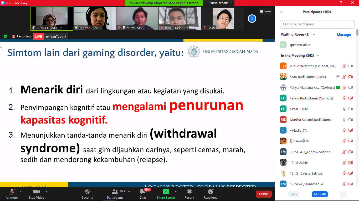 Pembicara dalam webinar ini adalah Ibu Nurul Kusuma Hidayati, M.Psi., Psikolog dan Bapak Yahya Maulana Argito dari Center of Public Mental Health, Fakultas Psikologi, UGM. Kedua narasumber tersebut memberikan penjelasan mengenai gaming disorder dan bagaimana bermain game online bisa lebih berpotensi membuat pemainnya kecanduan.