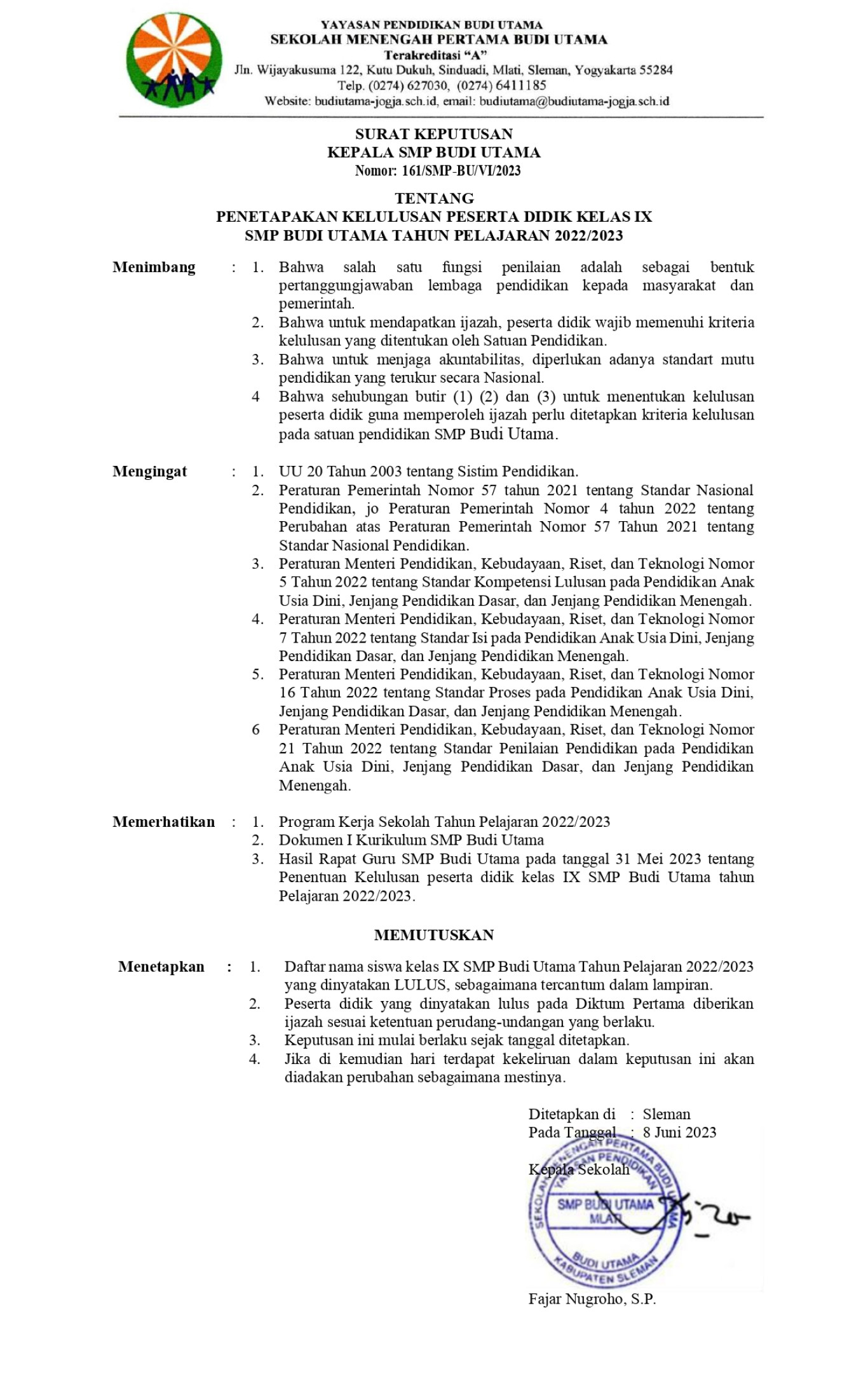 PENETAPAN KELULUSAN PESERTA DIDIK SMP BUDI UTAMA T...