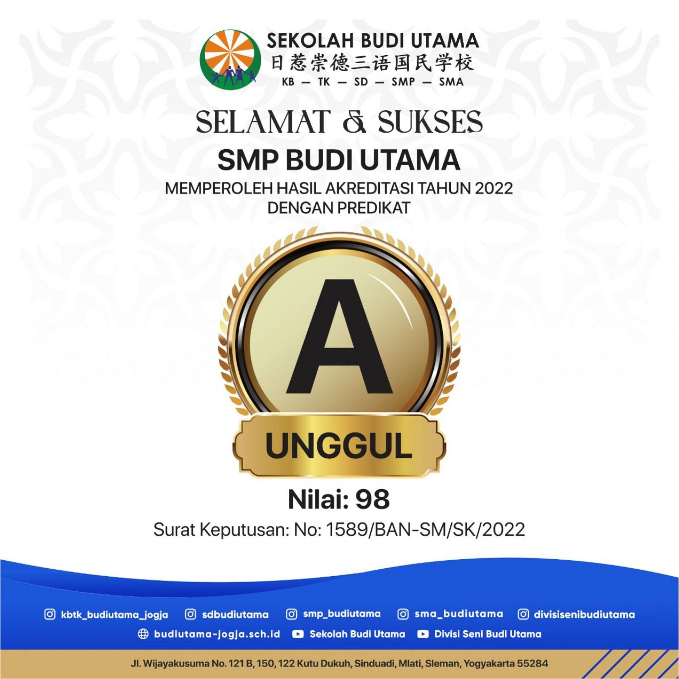Selamat dan sukses akhirnya, SMP Budi Utama memperoleh hasil Akreditasi Tahun 2022 dengan predikat A (Unggul), nilai 98 Berdasarkan SK Ketua BANSM No 1589/BAN-SM/SK/2022. Setelah mempersiapkan diri d...